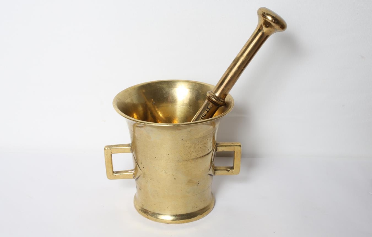 Gyllt mortel með tveimur köntuðum eyrum og staut. Talan "2" á botninum. Frá Arnheiðarstöðum.