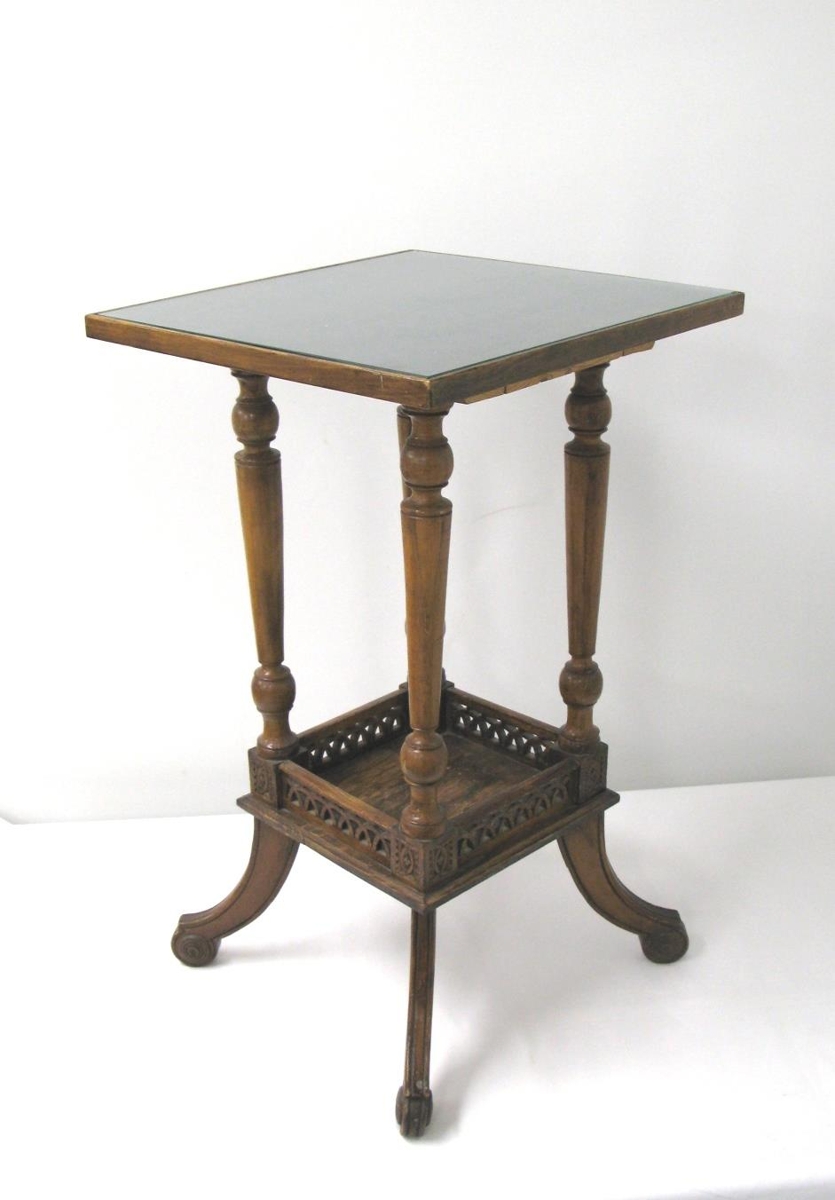 Dökkbrúnt lítið blómaborð þar sem glerplata er felld ofan í og þar undir hvítur, heklaður dúkur. Renndir fætur undir hillu neðarlega með útskornum rekka í kring og fætur útskornir eins og væru hjól og strikaðir. Úr tveimur eða fleiri viðartegundum.