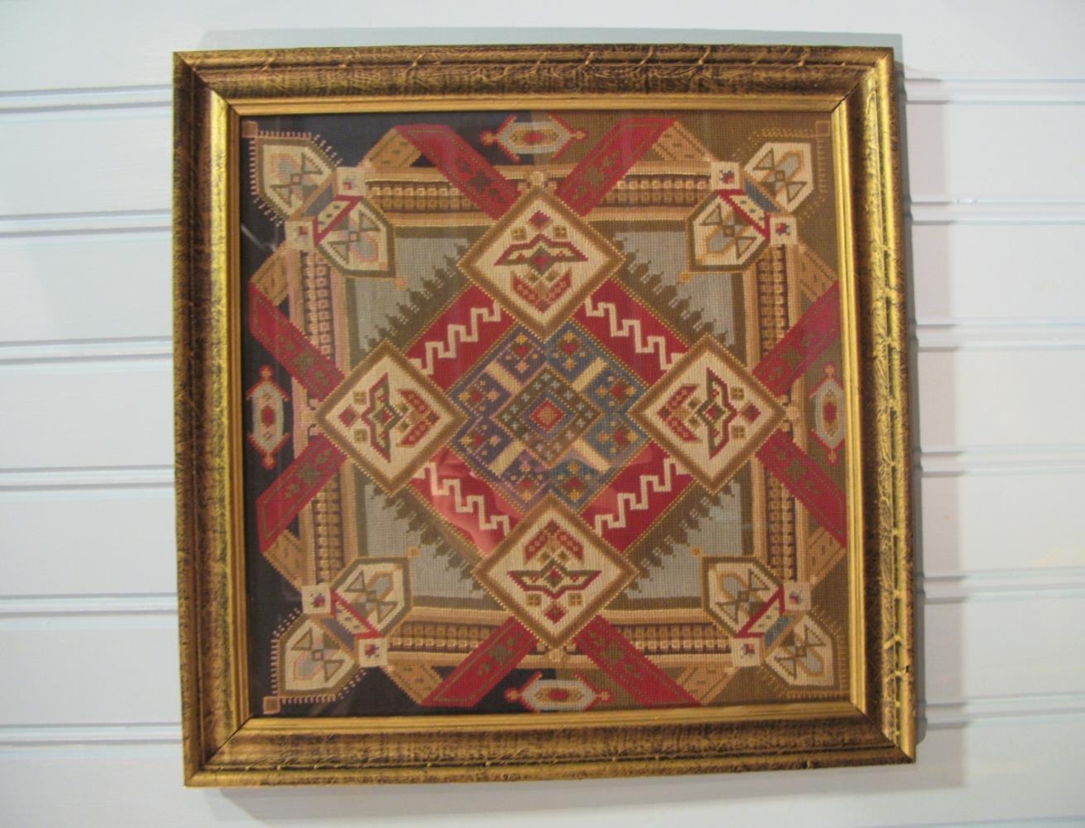 Útsaumur í gylltum ramma, saumuð með ullarbandi í grænum, brúnum, rauðum og bláum litum. Annars konar band í tveimur ljósum litum. Krosssaumur. Sigríður Sigfúsdóttir á Arnheiðarstöðum saumaði árið 1874. Var áður felld undir glerplötu á borðinu no. MA-1990-22.