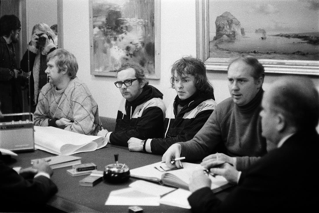 Vestmannaeyjagos, fyrstu dagarnir, fyrsta nóttin. Magnús H. Magnússon bæjarstjóri og nokkrir aðrir karlmennsitja á fundi inni á skrifstofu.