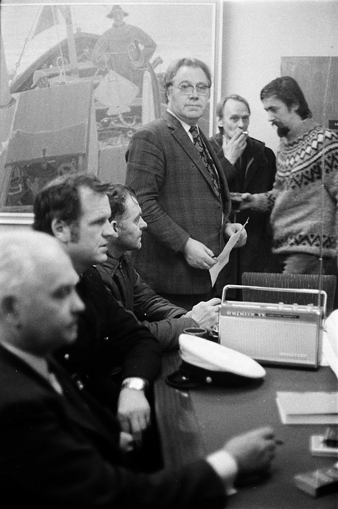 Vestmannaeyjagos, fyrstu dagarnir, fyrsta nóttin. Lögreglumaður ásamt nokkrum karlmönnum sitja við borð, útvarpstæki á borðinu.