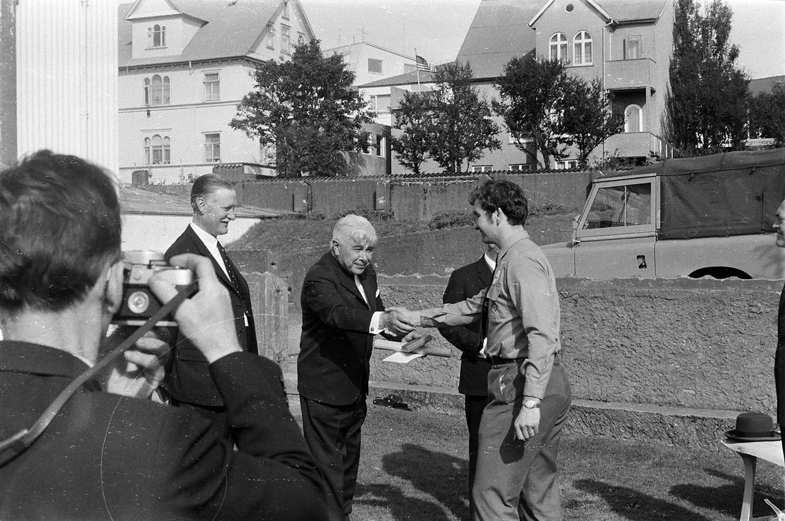 Reykjavík. Hallargarður. Burton-skátar (?) í heimsókn, ágúst 1968. Forsætisráðherra tekur í hönd skáta og þakkar fyrir skjalið. Karlmaður með myndavél í forgrunni.