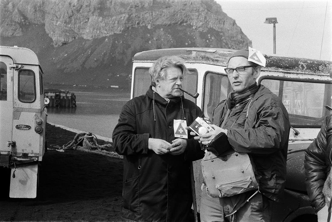 Vestmannaeyjar - mars 1973. Sigurður Þórarinsson og annar karlmaður við jeppa niður á bryggju. Ási í Bæ til vinstri.