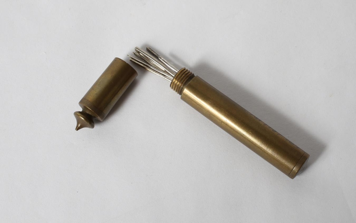 Sívalt, slétt, mjóir skrautbekkir rispaðir á sinn hvorum enda. Lokið skrúfað á og á því er hnúður til skrauts. Bogi Jónsson, móðurbróðir gefanda renndi nálhúsið milli 1920-1930 og gaf systur sinni. Bogi var fæddur í Tunghaga en bjó á Eskifirði og síðar í Hafnarfirði. Hann smíðaði töluvert úr kopar.