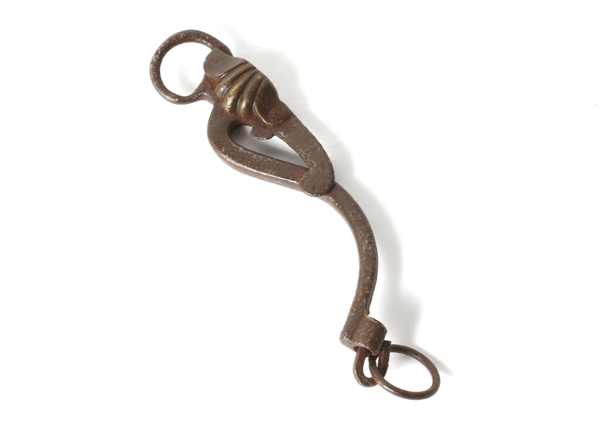Stök beislisstöng úr kopar. Skreytt. Úr eigu Jóhanns S. Jónssonar frá Bessastöðum í Fljótsdal (f.24.08.1900).