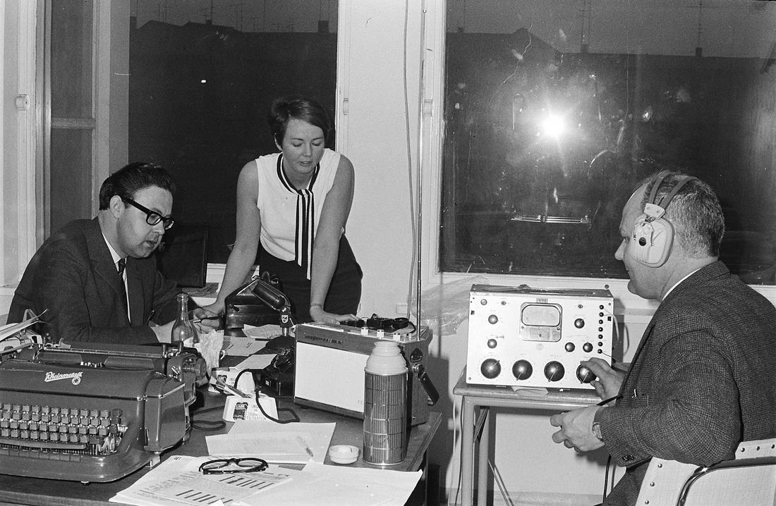 H - nótt og dagur, 26. maí 1968. Tveir karlmenn og ein kona. Fjarskiptatæki, ritvél, útvarp. „Þessi mynd og aðrar álíka eru teknar þegar skipt var í hægri umferð, 26. maí 1968. Held að höfuðstöðvarnar hafi verið í „Sjávarútvegshúsinu“ “ (MÁ 2014)