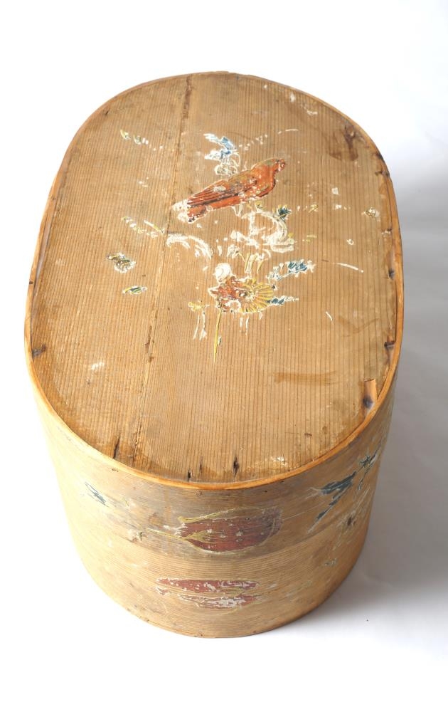 Frekar stór sporöskjulaga trafaaskja. Trénegld (nýlega viðgerð með lími). Ámáluð blóm, lauf og fuglar, orðið mjög máð. Sigríður Guðbjörg Anna Sigmundsdóttir frá Ljótsstöðum á Höfðaströnd (f. 09.11.1862, d.16.07.1922), átti öskjuna og það sem í henni var (sjá MA-1986-13 og MA-1986-14). Sigríður giftist Guttormi Vigfússyni sem var fyrsti skólastjóri Búnaðarskólans á Eiðum, síðar bóndi á Strönd í Vallahreppi og síðan í Geitagerði í Fljótsdal.