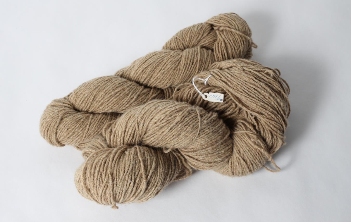 Tvær garnhespur. Þelband, þrinnað og ljósbrúnt. Garnið spann Helga Þormar húsfreyja í Geitagerði 1924 - 54 (f. 03.04.1889 að Ánastöðum, Mýrum – Bfs (Þá Þorvaldsdóttir)). Hespurnar hafa líklega verið á handavinnusýningu í Fljótsdal 1929 þegar landsýningin 1930 var í undirbúningi.