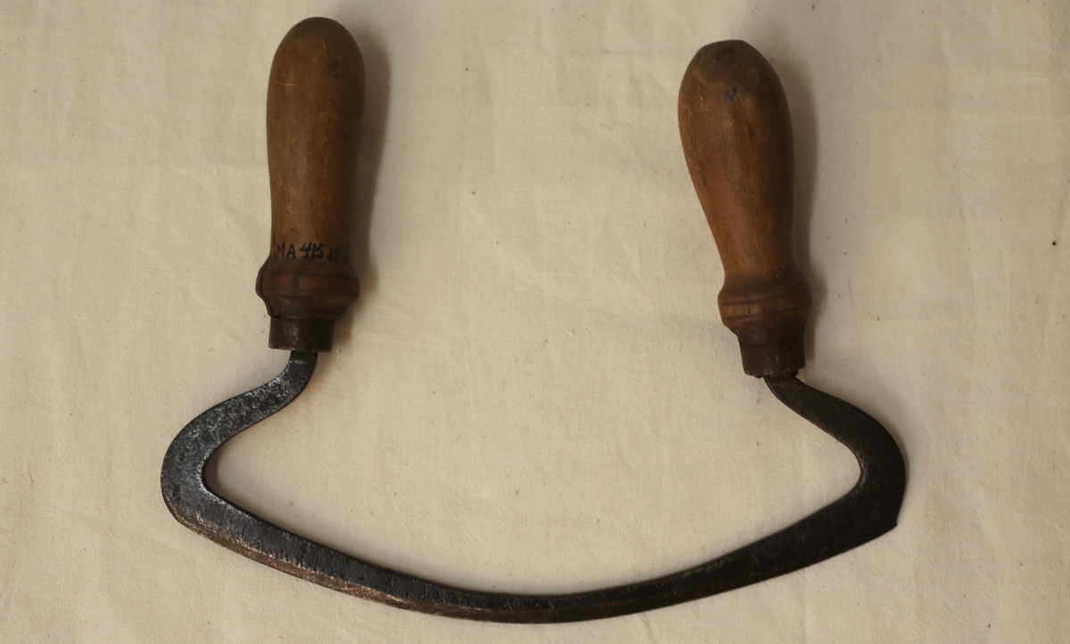 Bitjárn með tveimur handföngum. Halldór Benediktsson, bóndi á Skriðuklaustri, smíðaði handa Pétri Halldórssyni, föður gefanda, úr þjöl.
