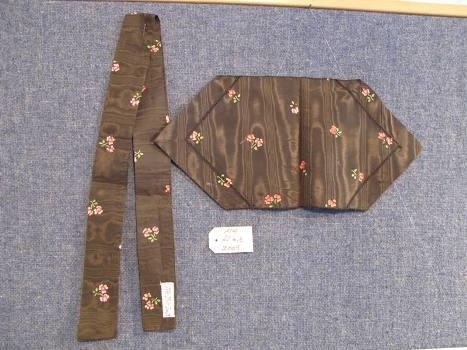Svört slaufa og lindi. Ámálaðar rauðar, bleikar og grænar litlar rósir. Notað til að búa til slaufu við peysuföt. Úr eigu Margrétar Þorsteinsdóttir, Víðivöllum ytri.