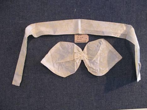 Hvít slaufa (heimasaumuð) með áþrykktum ljósum rósum. Slaufan er tekin saman í miðju með rykkingu. Samskonar lindi er með.