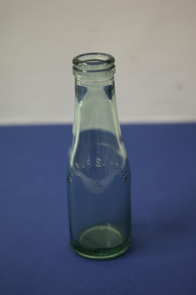 Glær flaska, áletruð: "Mjólkursamsalan 1/4". Frá Klúku.