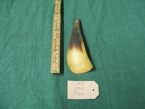 Skóhorn úr ljósu og kökku kýrhorni. Efsti hluti hornsins notaður. Kom úr dánarbúi Jóns Hallasonar.