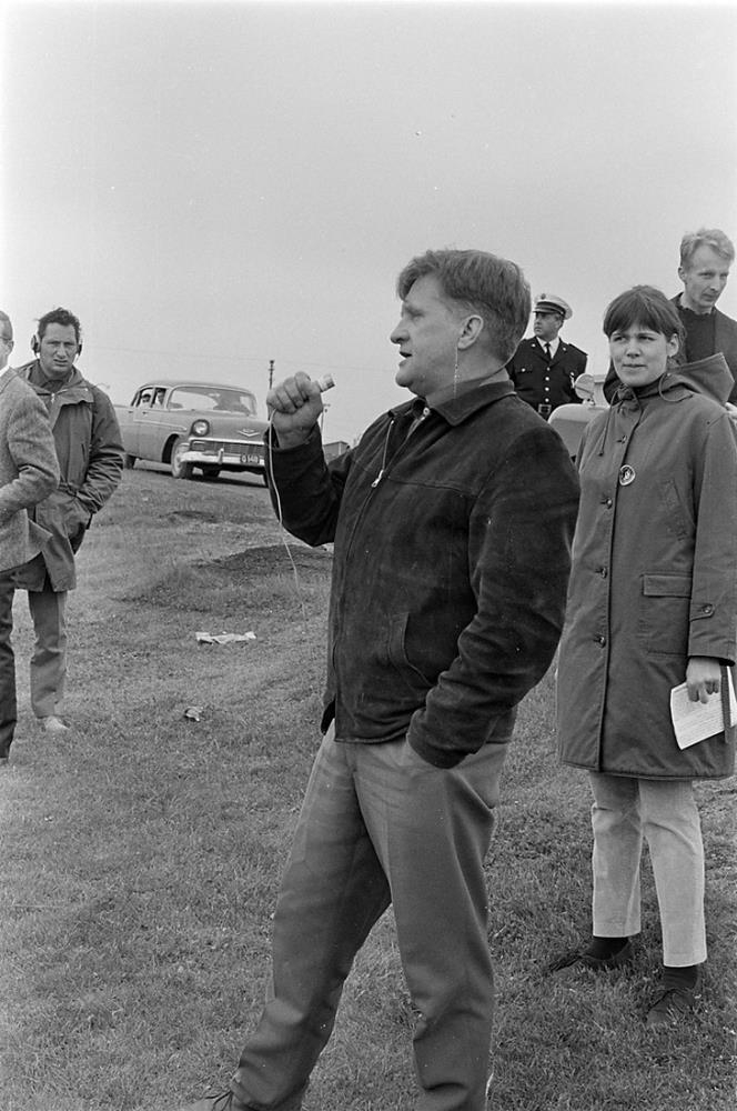 Úr Keflavíkurgöngu. Upphaf göngu og útifundur við Miðbæjarskóla, 23. júní 1968. Karlmaður talar í einhvers konar hljóðnema. Blaðamenn, kona og lögreglumaður.