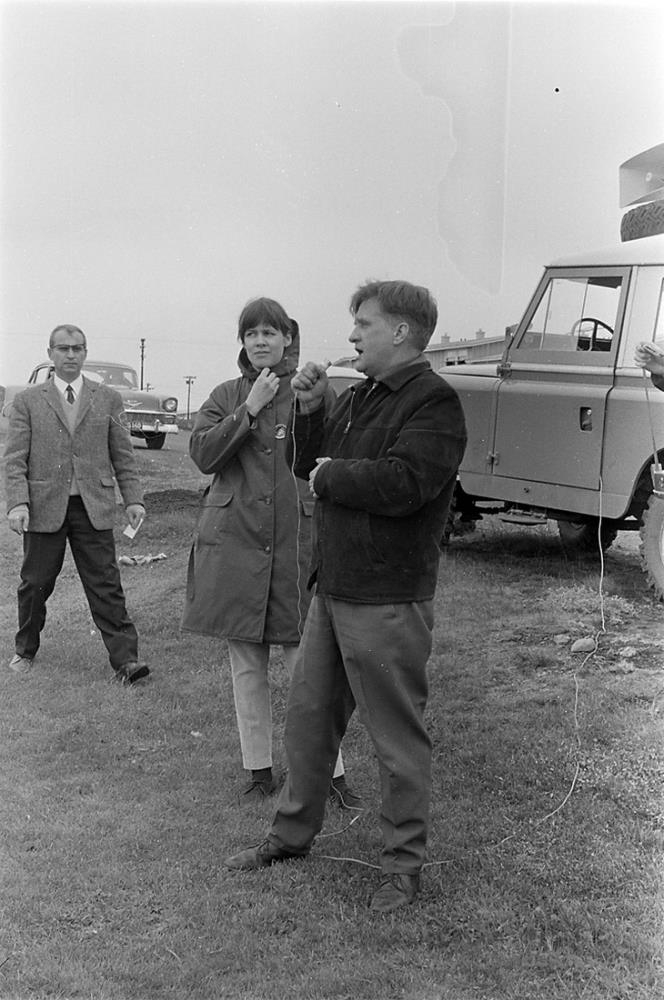 Úr Keflavíkurgöngu. Upphaf göngu og útifundur við Miðbæjarskóla, 23. júní 1968. Göngumenn, kona og karlmaður, tala í hljóðnema. Jeppi með hátalara upp á toppi.