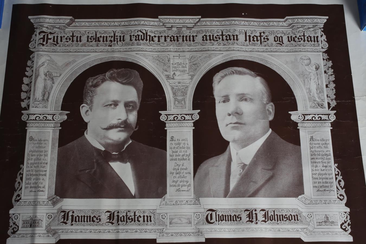 Myndin er af tveimur fyrstu íslensku ráðherrunum austan hafs og vestan, þeim Hannesi Hafstein og Tómasi Jónssyni. Utan um myndirnar er teiknaður rammi, fagurlega skreyttur. Inn í hann er fléttað ýmsum smámyndum og kvæðum. Kemur frá frá Hafrafelli.