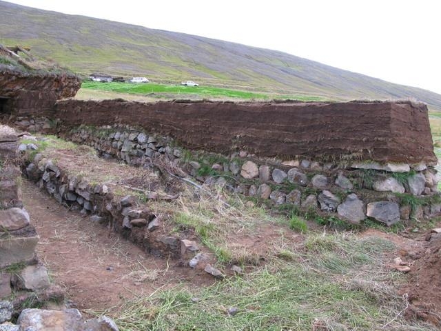 Myndin er tekin á Tyrfingsstöðum á Kjálka í Skagafirði í ágúst 2008. Fjárhúsin "út og niður" (í norðvesturhorni gamla túnsins). Á myndinni sjást syðri húsin af tveimur með grjóthlöðnum garða en veggir eru grjóthlaðnir með streng á milli neðst en ofan á torfhleðsla úr streng. Lengst til vinstri sér í hlöðuvegginn sem er hlaðinn úr klömbruhnaus.
