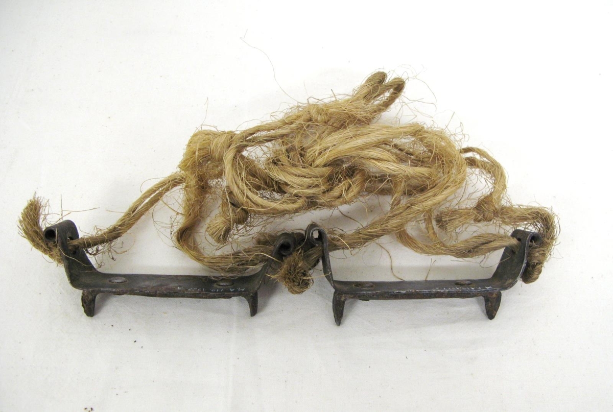 Einföld, mjó járnræma með tveimur broddum. Bundin yfir ristina með snæri. Frá Hafrafelli.