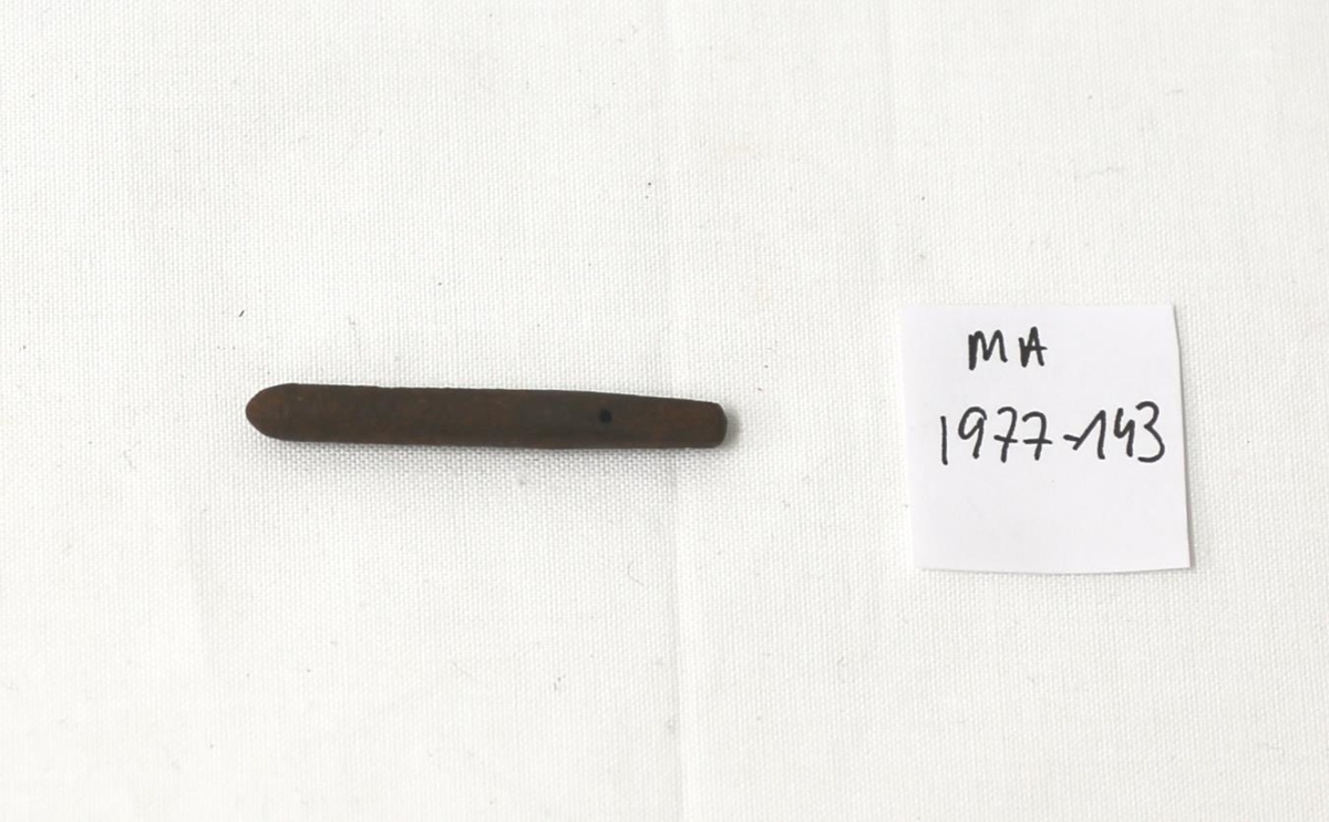 Pínulítill járnpinni, göt í gegn efst. Ryðgaður. Var í kassa MA-1977-138 frá Hafrafelli sem var í eigu Halldórs Guttormssonar.