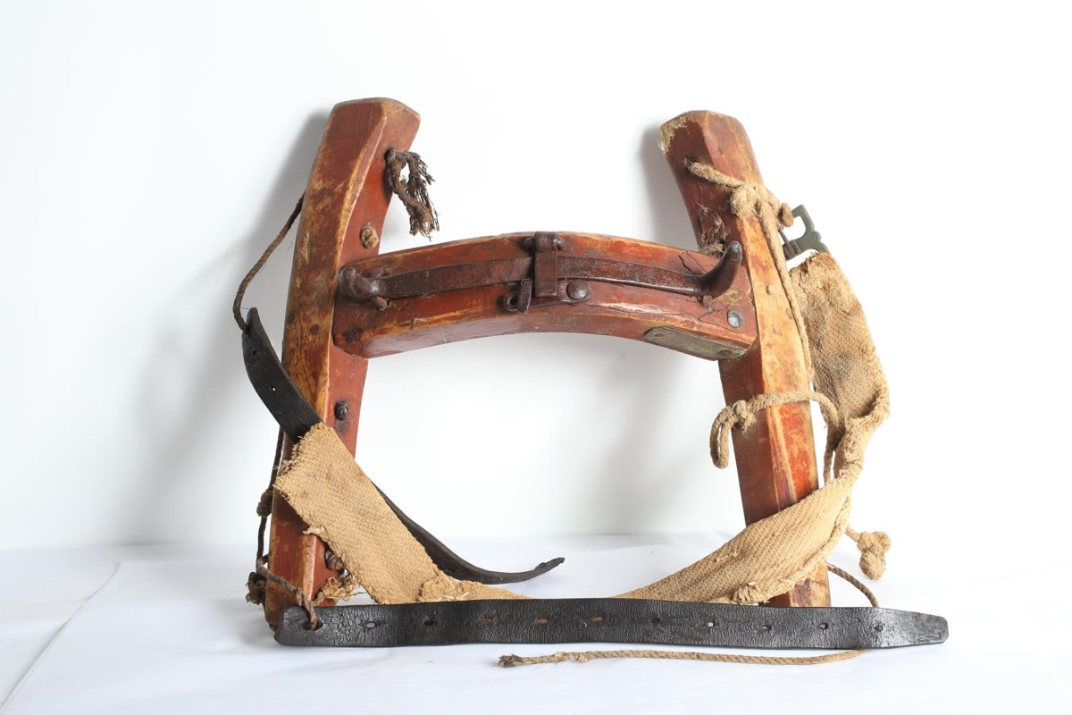 Rauður klyfberi með hleypiklökkum, gjörð úr leðri og ofinni gjörð úr snæri.