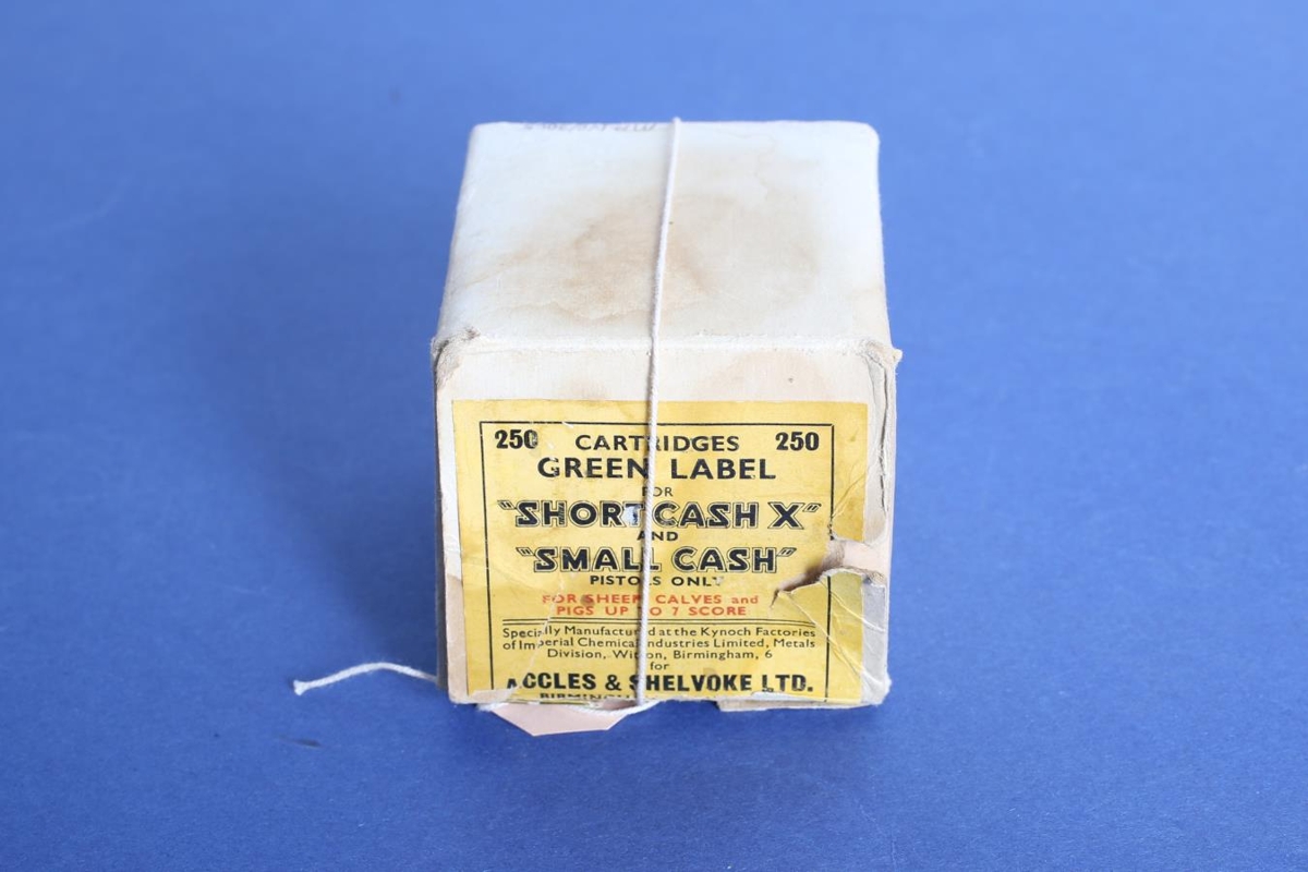 Green-label púðurskot í kindabyssu. Næstum fullur kassi. Var notað við sauðfjárslátrun í sláturhúsinu á Reyðarfirði sem var í eigu KHB. Kemur frá Óskari Ágústssyni (d. 2004) frá Grund í Reyðarfirði. Vann lengi sem rotari í sláturhúsinu.