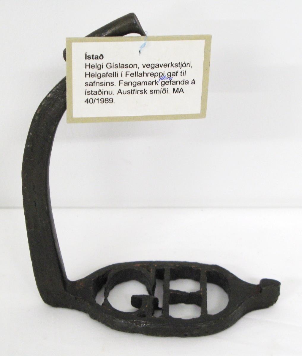 Eitt ístað með "G.H." í stigplötu. Fangamark eiganda, Gísla Helgasonar. Austfirsk smíði.