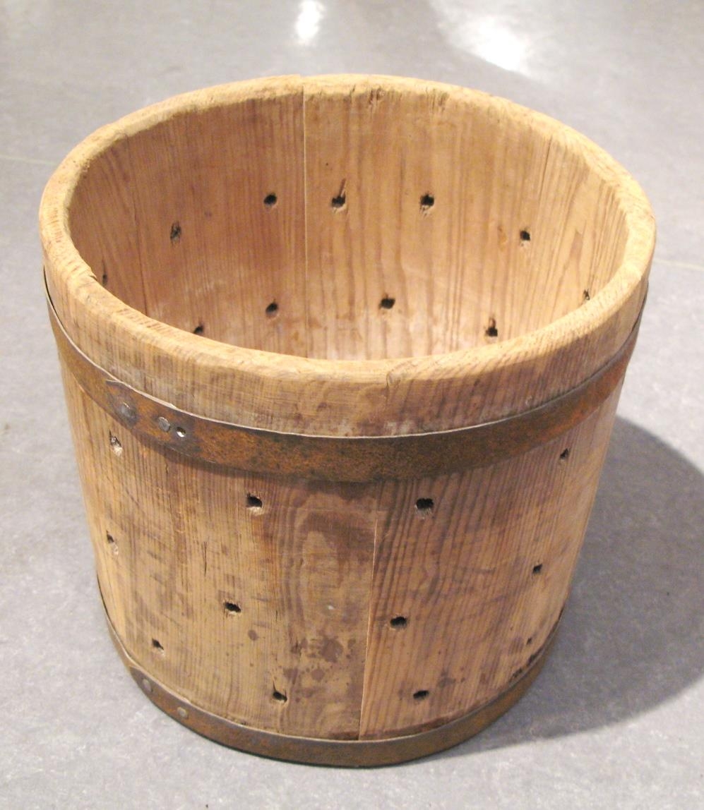 Járngirt stafaílát með þremur gataröðum yfir belginn og loki á sem gengur niður í dallinn.