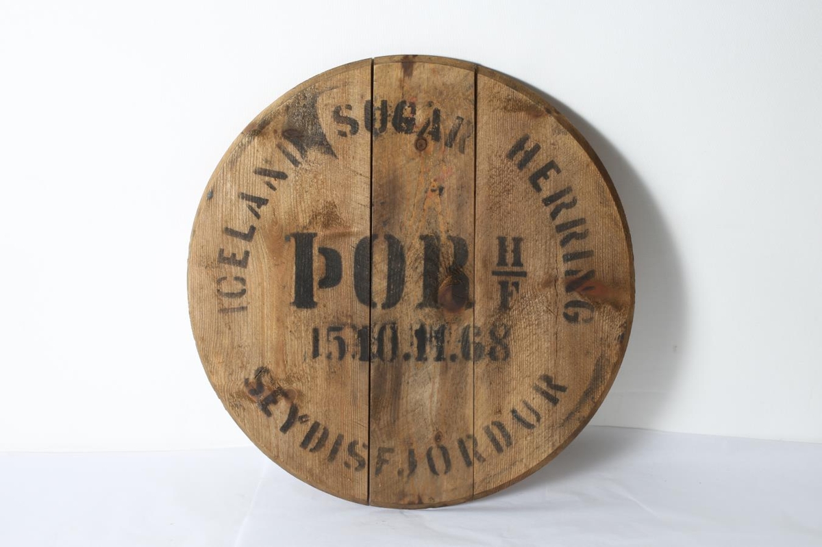 Lok af síldartunnu, kringlótt. Áletrunin: ICELAND SUGAR HERRING SEYDISFJÖRDUR ÞOR H/F 15.10.11.68. Síldarplanið Þór á Seyðisfirði var rekið af Grétari Brynjólfssyni bónda á Skipalæk hluta sjöunda áratugar 20. aldar.