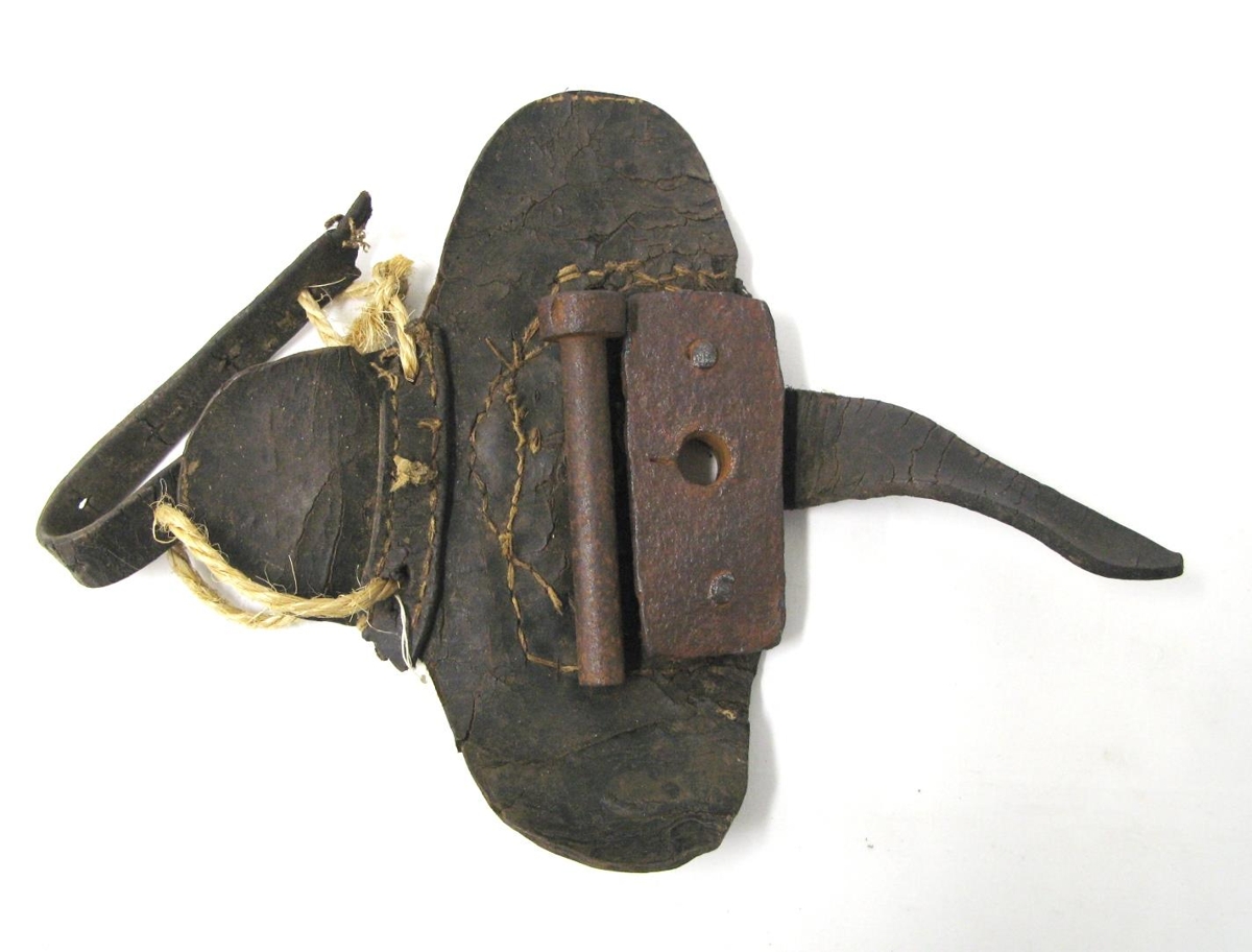 Svartur járnfleinn gengur í gegn um leðurgrímu sem fer upp á snoppuna, hylur augun og nær aftur á hnakka. Með hnallinum var síðan slegið á járnpinnann sem gekk þá gegn um hauskúpuna framanverða. Úr búi gefanda, Önnu Jónsdóttur og manns hennar. Á að fylgja rothnalli (MA-1976-5).