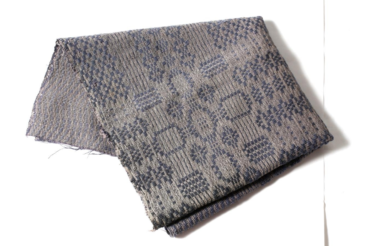 Hluti af ofnu dívanteppi sem er í bláum litum. Fín og heilleg. Var ábreiða á rúm.