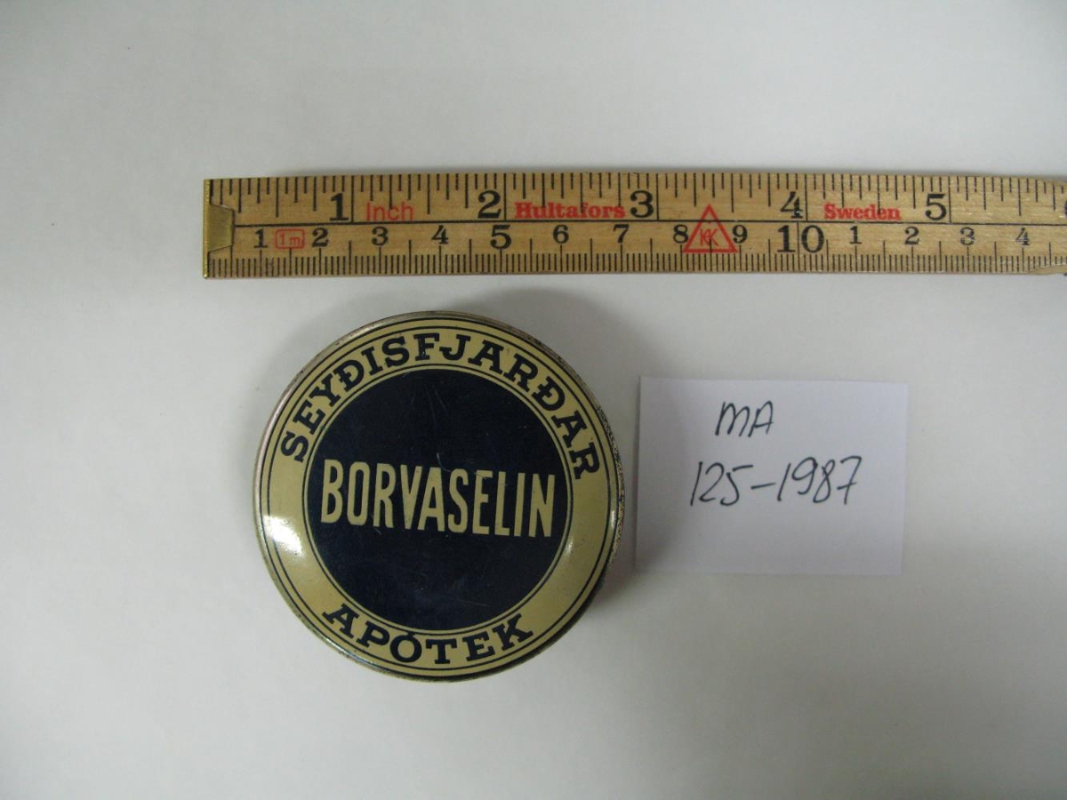 Dós með borvaselíni. Lokið ljós og dökkblátt, merkt: "Seyðisfjarðarapótek. Borvaselin". Úr búi foreldra gefanda.