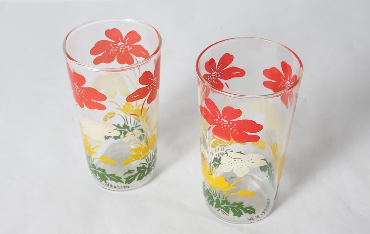Glær glerglös með hvítu, gulu, rauðu og grænu blómamunstri.
