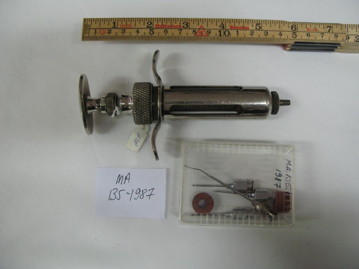 Venjuleg bráðasprauta.Fjórar nálar og gúmmí í kassa.