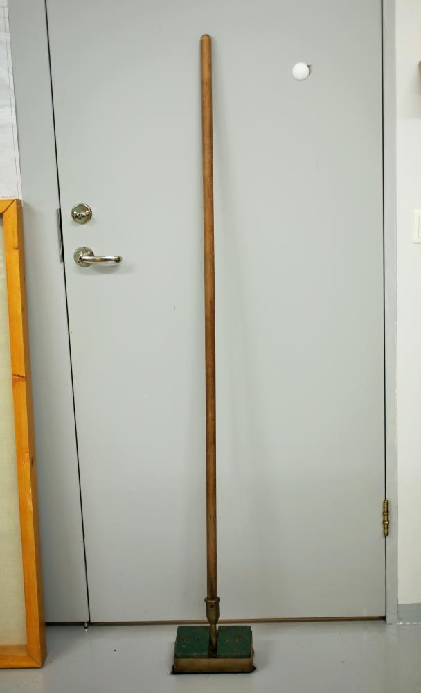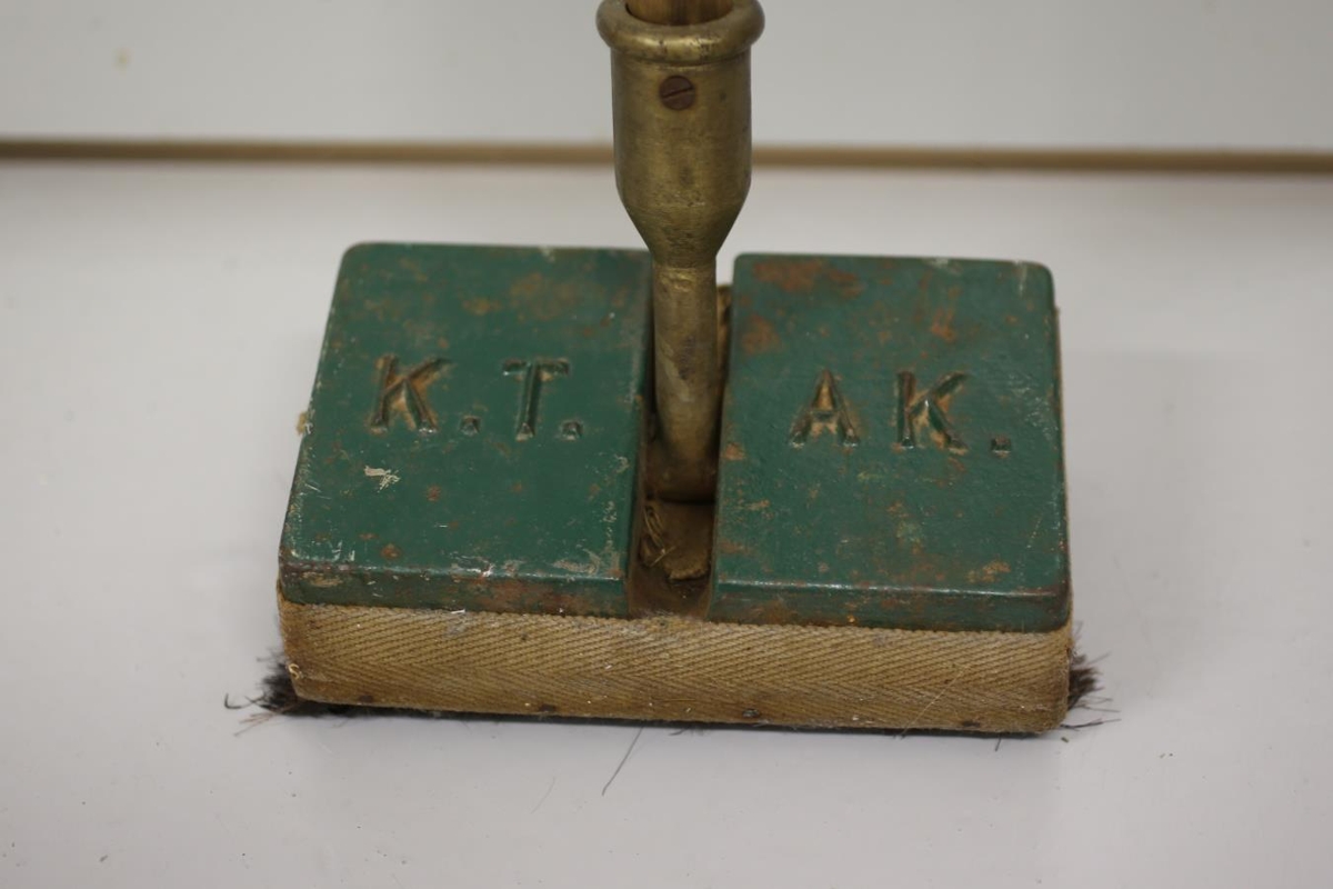 Níðþungur kústur á kústskafti. Kemur í hólk úr látúni og er neðsti hluti úr járni, grænmálaður og stendur KT. öðru megin og AK. hinumegin. Undir er svo bursti. Úr dánarbúi Jónasar Péturssonar, Lagarfelli 8, Fellabæ.