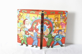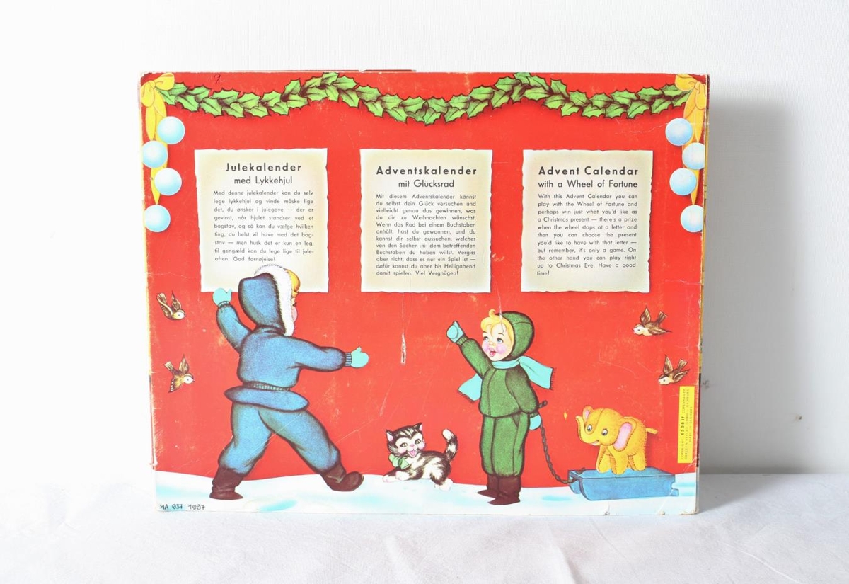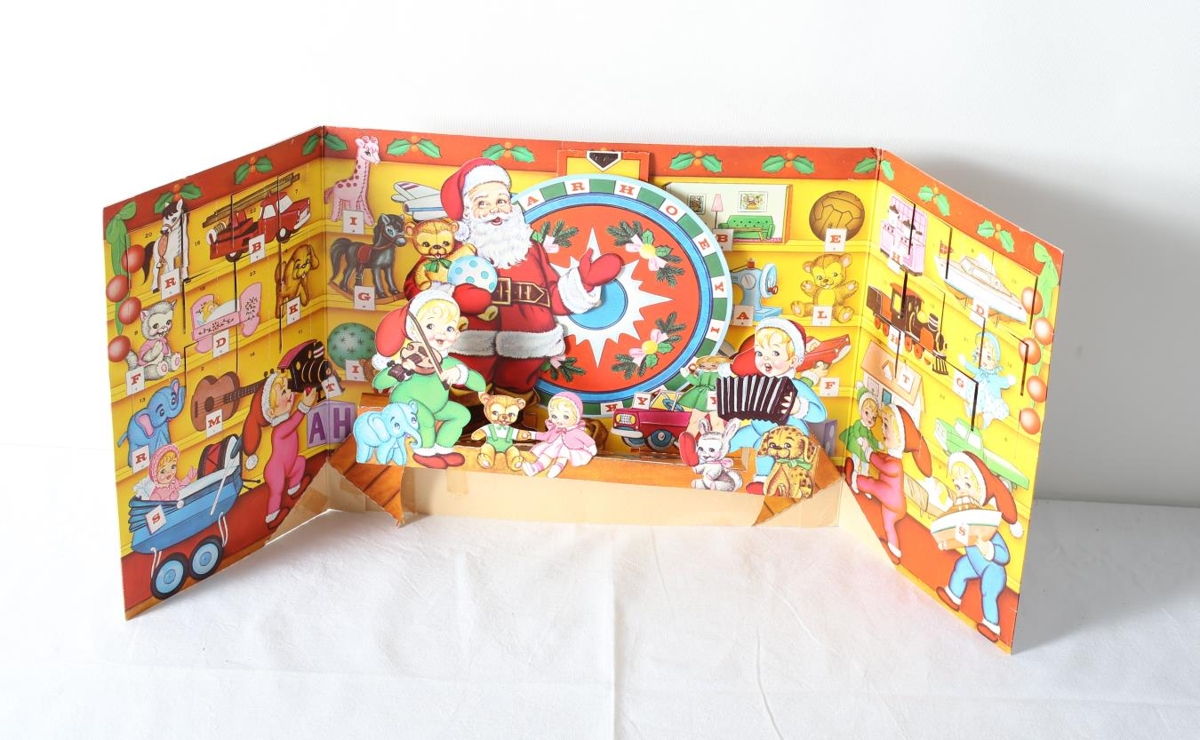 Jóladagatal úr þunnum pappa. Hægt að leggja saman. Þegar það er opnað er það eins og tívólíbúð með lukkuhjóli og dóti í hillum sem hægt er að vinna. Þar er og jólasveinn, börn, dýr og dót. Og svo 24 rúður sem hægt er að opna fyrir hvern dag í desember fram að jólum. Úr dánarbúi Jónasar Péturssonar, Lagarfelli 8, Fellabæ. Úr eigu dótturdóttur hans.