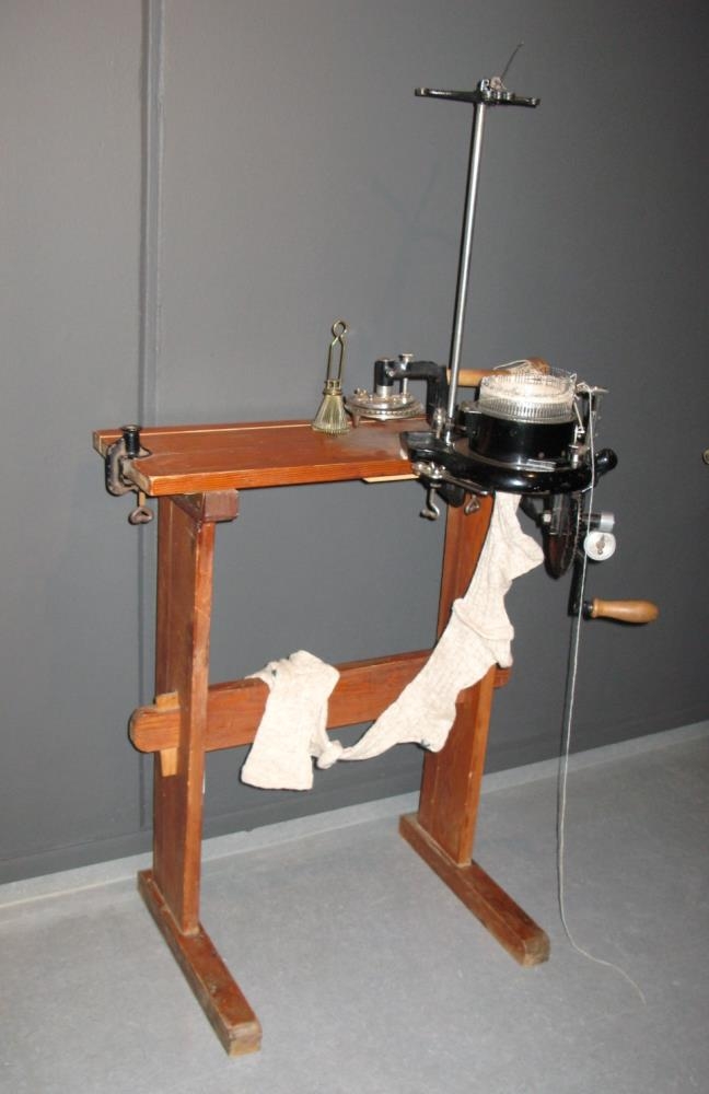 Vélin var skrúfuð á trébekk (70x70) sem gerður er úr tveimur borðum með okum undir til styrktar. Er með handfang úr hreindýrshorni. Sigríður Eiríksdóttir, húsfreyja í Bót, tengdamóðir gefanda eignaðist þessa prjónavél nýja um aldamót eða rétt fyrir. Aðalbjörg notaði vélina síðan og var prjónað á vélina fram undir 1960.