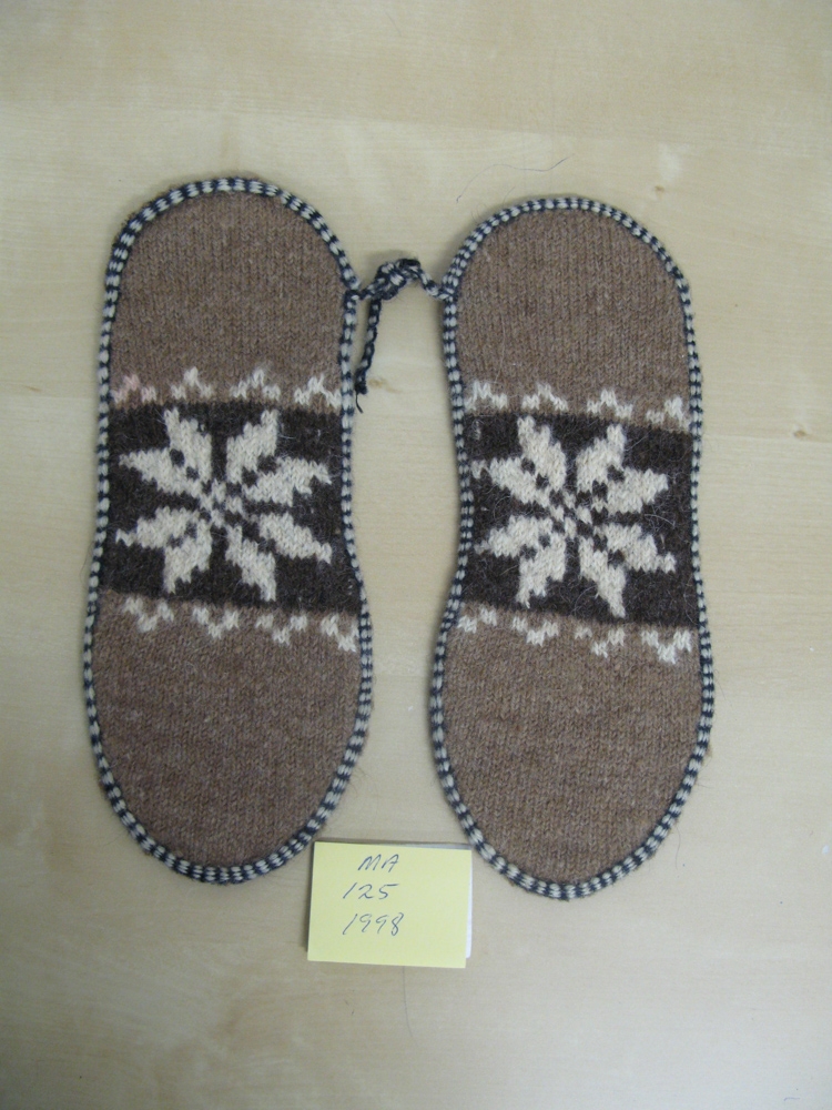 Leppar í sauðalitunum, með rós. Slyngdir með ljósu og svörtu. Tvöfaldir. Komu úr búinu á Bót. Gerðir af Önnu Halldóru Pétursdóttur, vinnukonu.