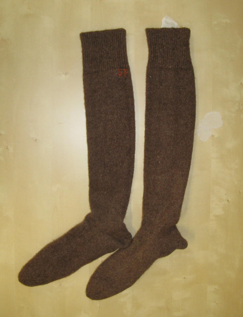 Mórauðir og háir sokkar, vélprjónaðir og þæfðir, merktir með krosssaum í appelsínugulu "S.P." sem eru upphafsstafir Stefáns Péturssonar sem var bóndi í Bót.