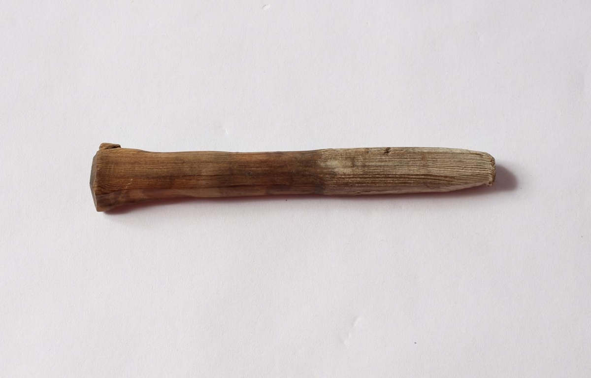 Trénagli, gróflega tálgaður, ekki beittur oddur og hausinn ekki breiður miðað við allan naglann. Hefir staðið í einhverju til hálfs og þar eru litaskil. Frá