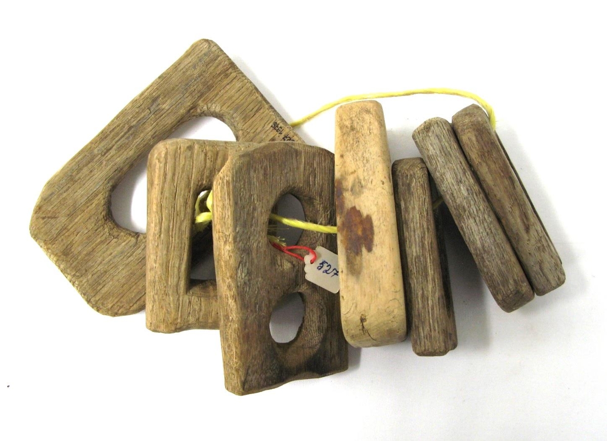 Með einu sporöskjulaga gati. Úr búi Sveins Bjarnasonar á Heykollsstöðum. Eru sjö saman á kippu.
