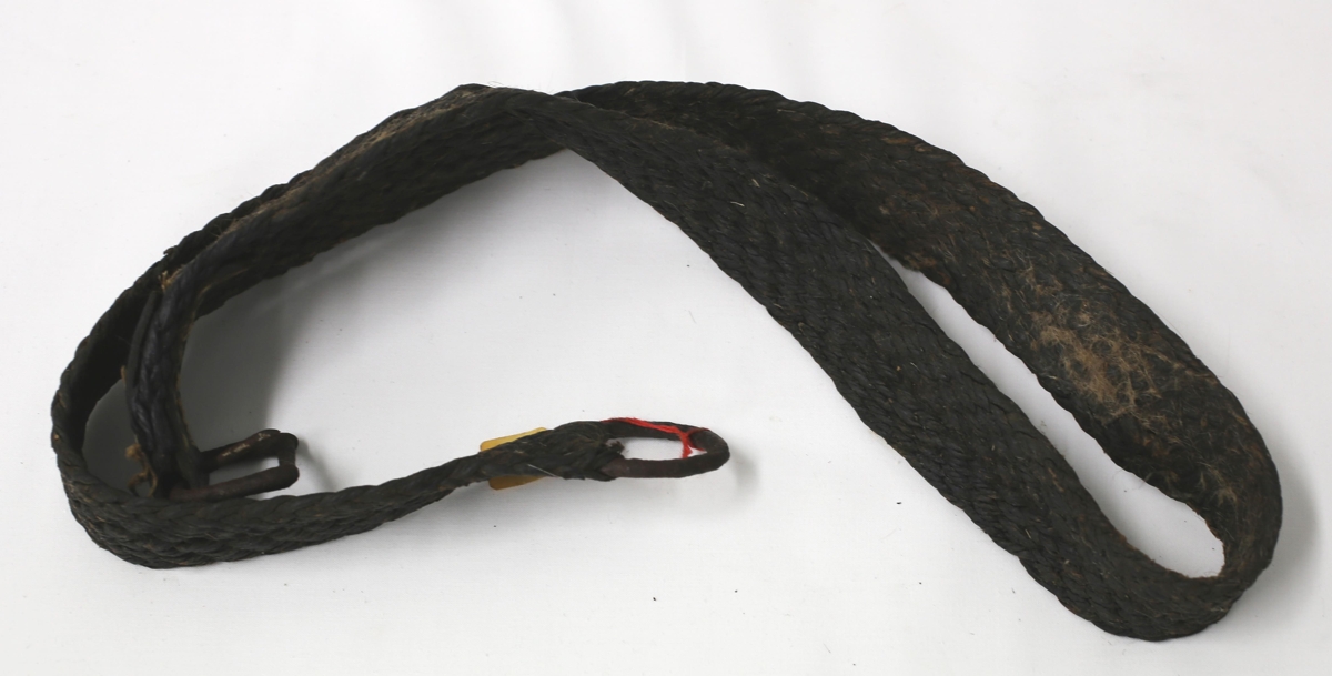 Brún klyfberagjörð, brugðin úr tjörubandi. Sylgjan mjög ryðguð. Brugðin af Einari Péturssyni frá Heykollsstöðum.