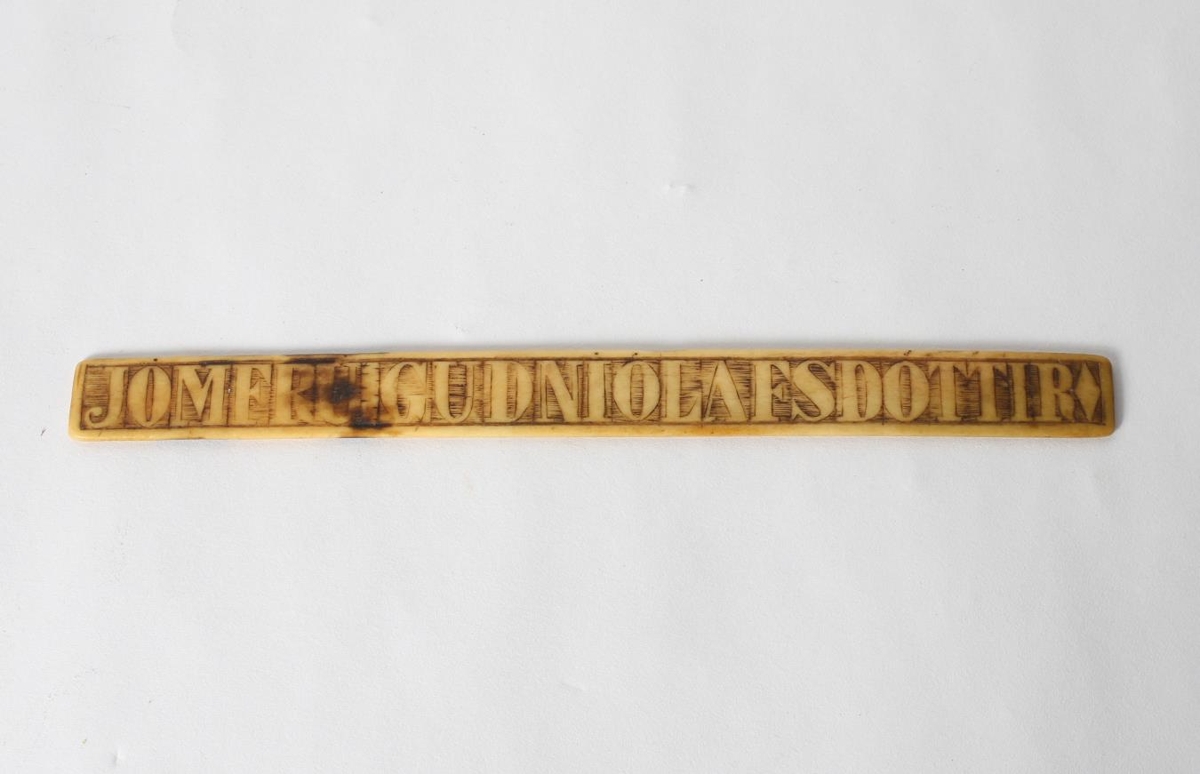 Í beinið er skorið "Jómfrú Guðný Ólafsdóttir". Eigandi var Guðný Ólafsdóttir frá Klúku, útskorið af Vilhjálmi Magnússyni í Jórvík. Vilhjálmur var mikill smiður.
