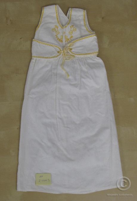 Hvítur bómullarkjóll m/ gulum útsaumi. Örlítið stoppaður á pilsi. Opinn að aftan, bundinn saman að framan. Útsaumuð mynd á bol. Notaður á fjögur börn gefanda. Saumað af Stefánný fyrir 1946 fyrir fæðingu elstu dóttur hennar, Elsu Þorbjargar Árnadóttur.