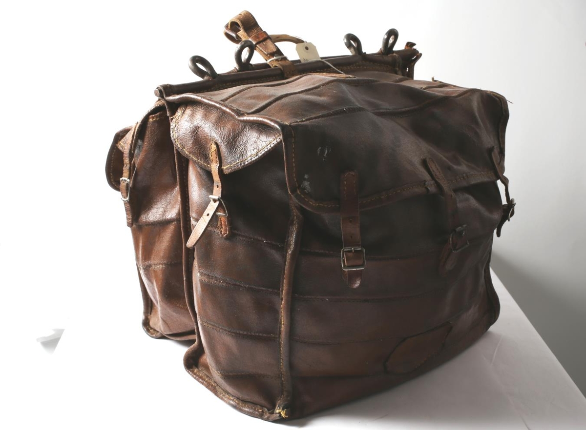 Tvær klyftöskur, upphaflega hemputöskur séra Sigurjóns Jónssonar (f. 23.08.1881 - d. 15.05.1965) frá Háreksstöðum í Jökuldalsheiði, sem lengst af var prestur í Kirkjubæ í Tungu. Síðan komast töskurnar í eigu Gunnars Ragnarssonar (f. 15.04.1940 - d. 30.09.1979) sem notaði þær sem pósttöskur í póstferðum sínum. Guðmundur Þorleifsson vann hjá símanum í þá daga og tók töskurnar til handagagns þegar Gunnar dó.