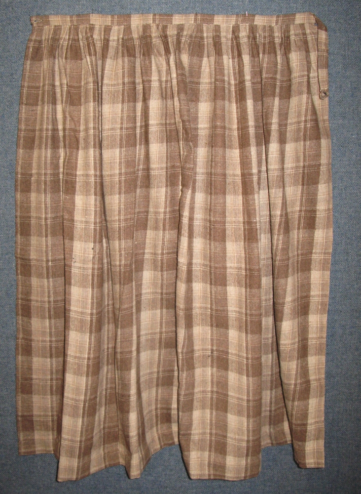 Úr brúnköflóttu efni, sett saman í miðju. Breidd hvers stykkis fyrir sig 60 cm. Úr eigu Þóreyjar Eiríksdóttur frá Bót, konu Páls Hermannssonar, bónda á Vífilsstöðum í Tunguhreppi.