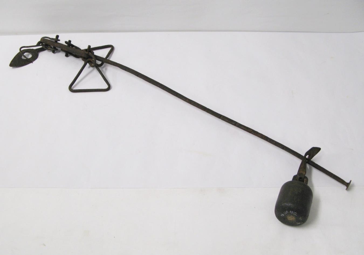 Ryðguð, mikið notuð, lóðið er líklega bronslóð. Úr búi Stefáns S. Jónssonar (f.1893 d.1968) frá Ekru.
