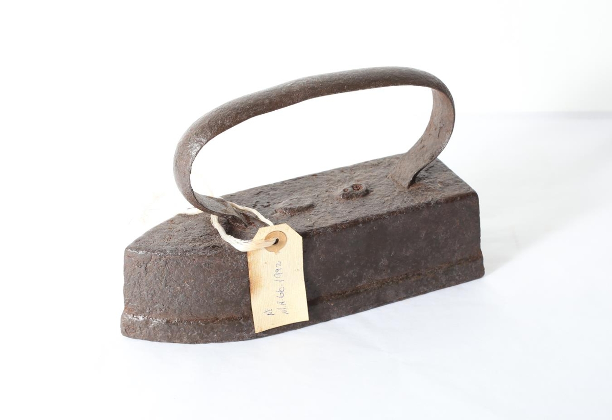 Stórt straujárn með járnhandfangi. Frá Ekru í Hjaltastaðaþinghá.