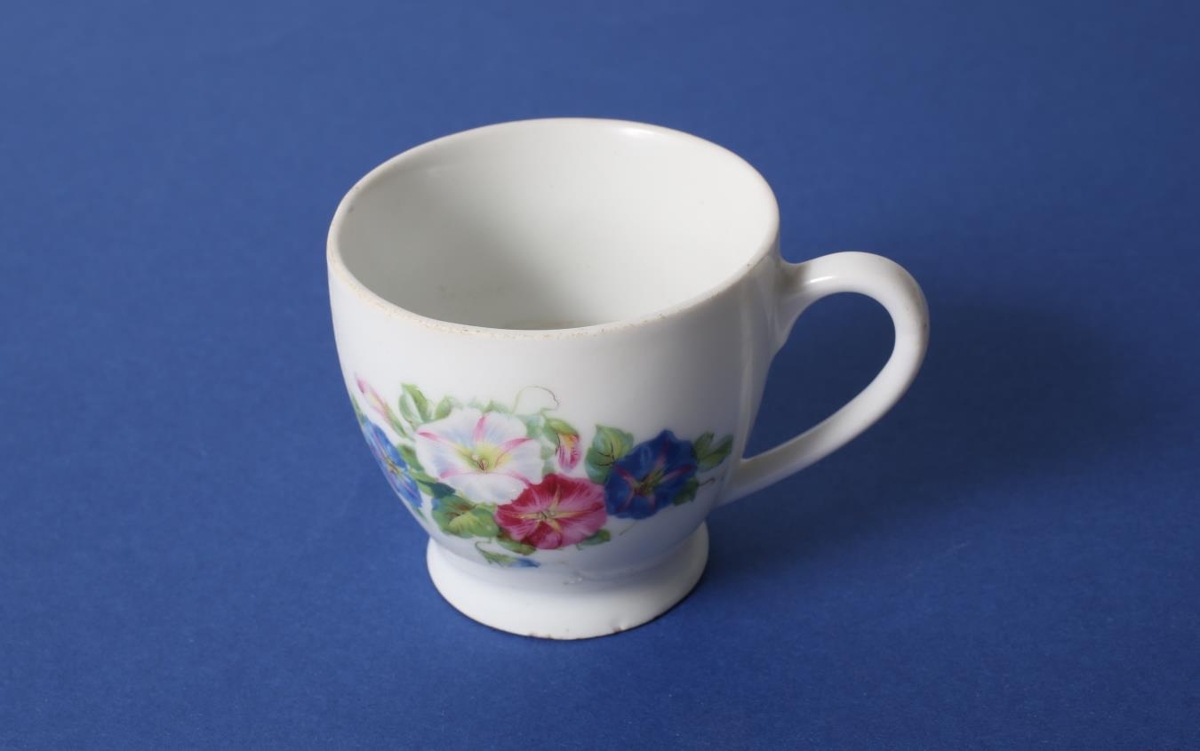 Kaffibolli, gamall með blómamynstri. Hefur brotnað og verið límdur saman. Bollann átti og notaði amma gefanda, Guðrún Guðmundsdóttir frá Ekru í Hjaltastaðaþinghá.