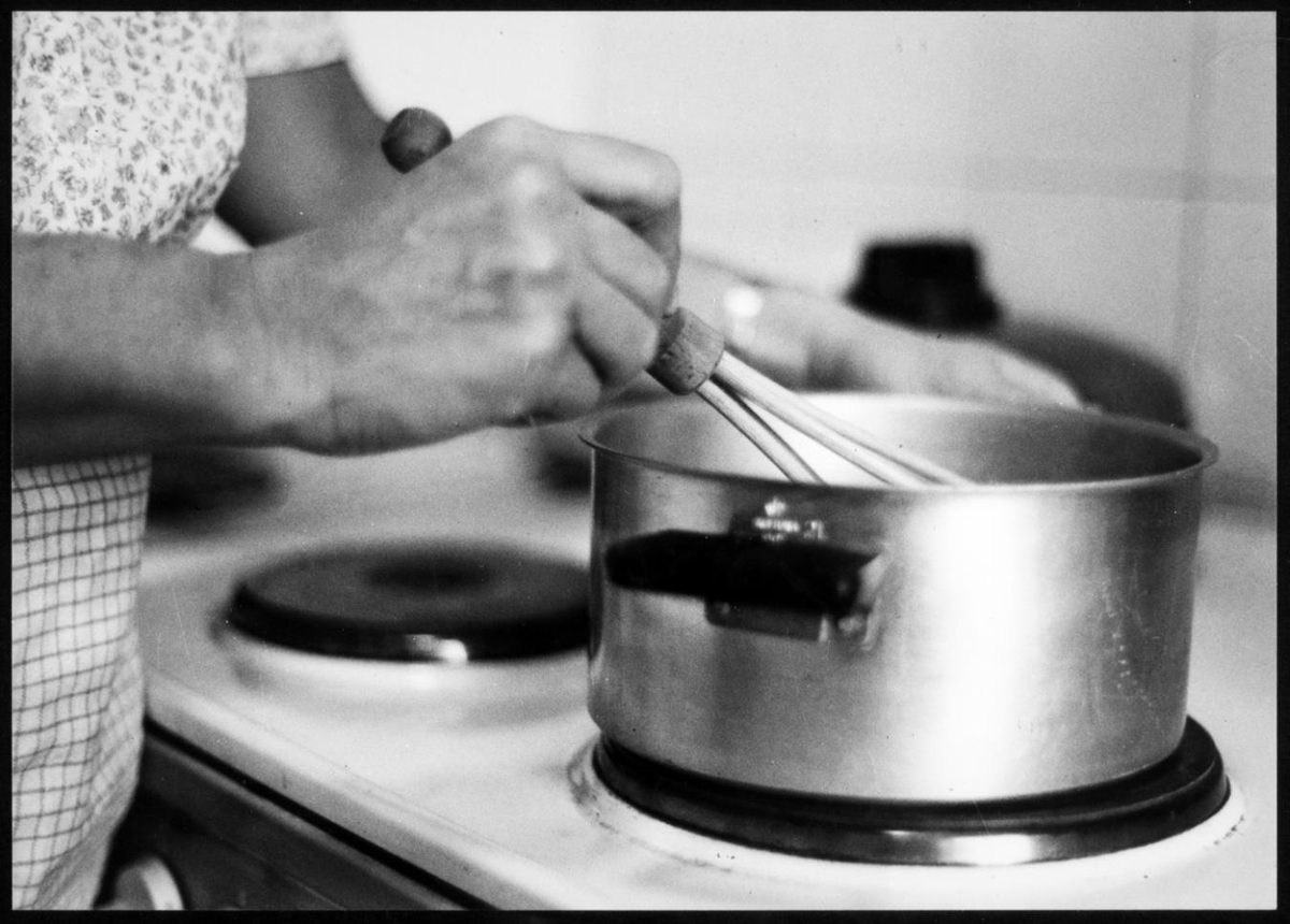 Konur - Heimilisstörf. Kona hrærir í potti á eldavél.