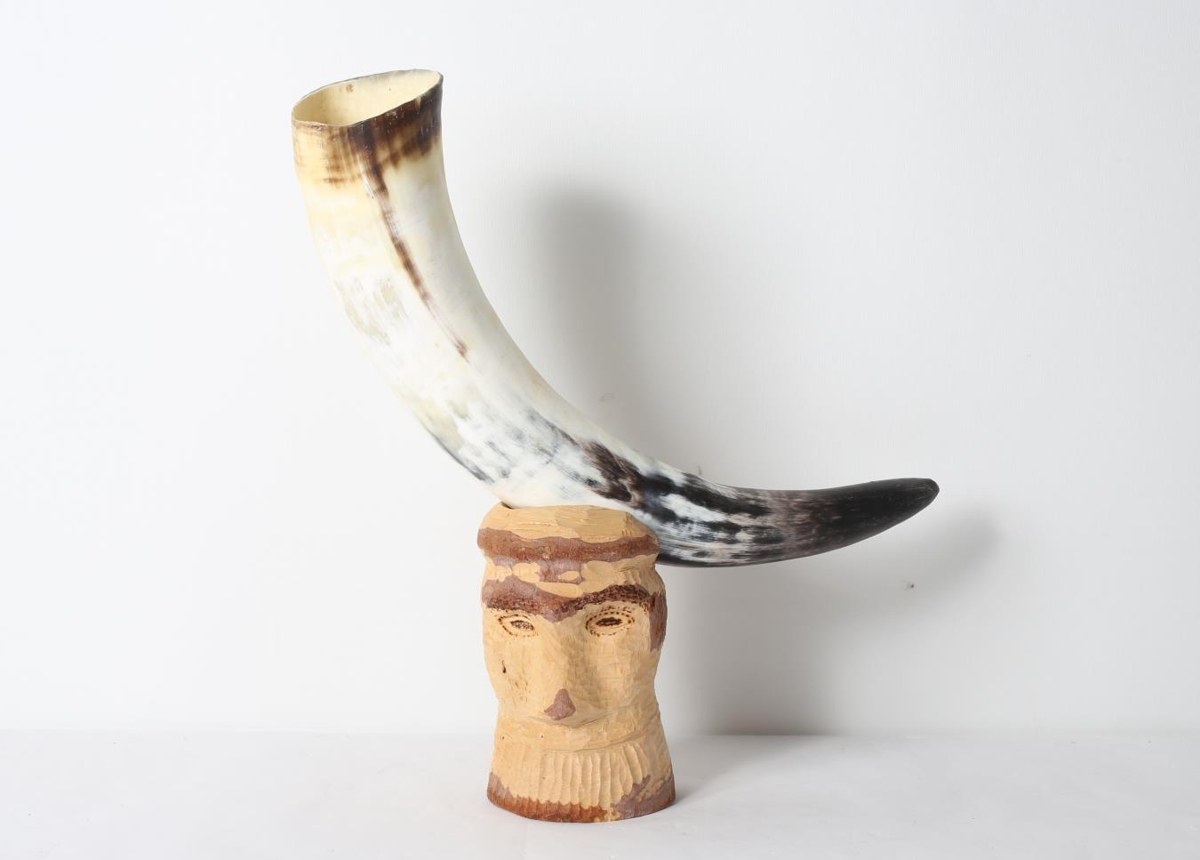 Nautshorn fest á útskorið mannshöfuð. Úr dánarbúi Sveins Einarssonar frá Hrjót í Hjaltastaðaþinghá, en Sveinn sjálfur gerði hlutinn.